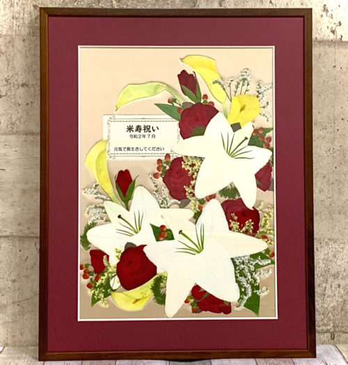 米寿のテーマカラーである金茶色のベースにお花がよく映える品のある作品になりました✨